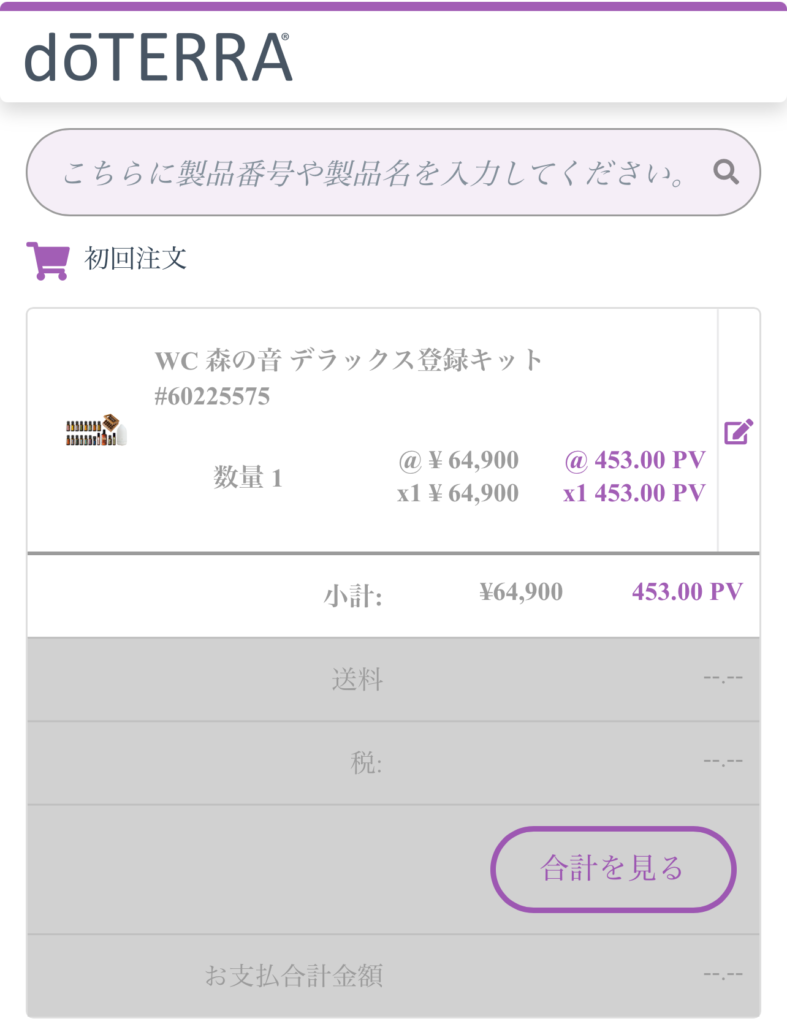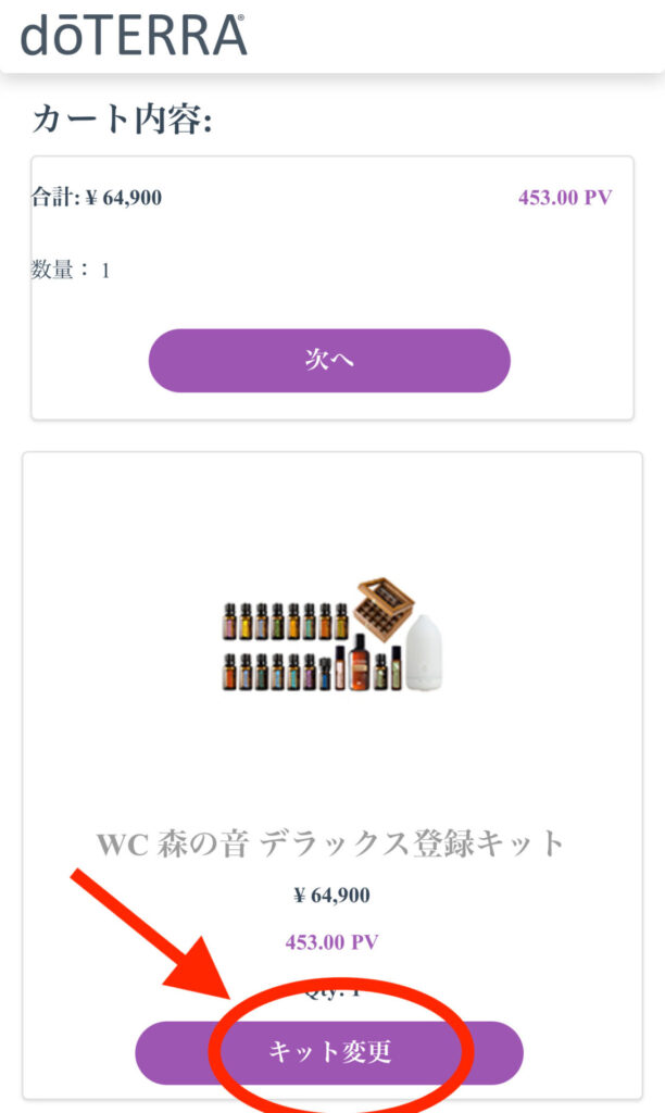 https://doterra.me/1Pz72Y お申し込みページには、お勧めの「森の音デラックス登録キット」がカートに含まれていますので【次へ】をタップします。 ※ ほかの商品をご希望の場合は、画面下部の【キット変更】よりご希望の商品をお選びください。